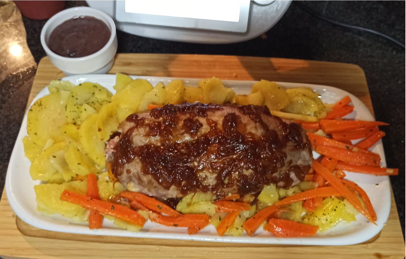 Por lo cual fui a mi plataforma Cookidoo y vi que me podía ofrecer los Dorados Básicos. Me decanté por la receta de cebolla dorada 200-300 g (nunca decepciona) una vez colocado sobre el solomillo me fui a buscar otra receta, pero no me terminaba de convencer y empecé a cambiar ingredientes, Así salió esta receta tan deliciosa, con la ayuda de cookidoo y mi Thermomix