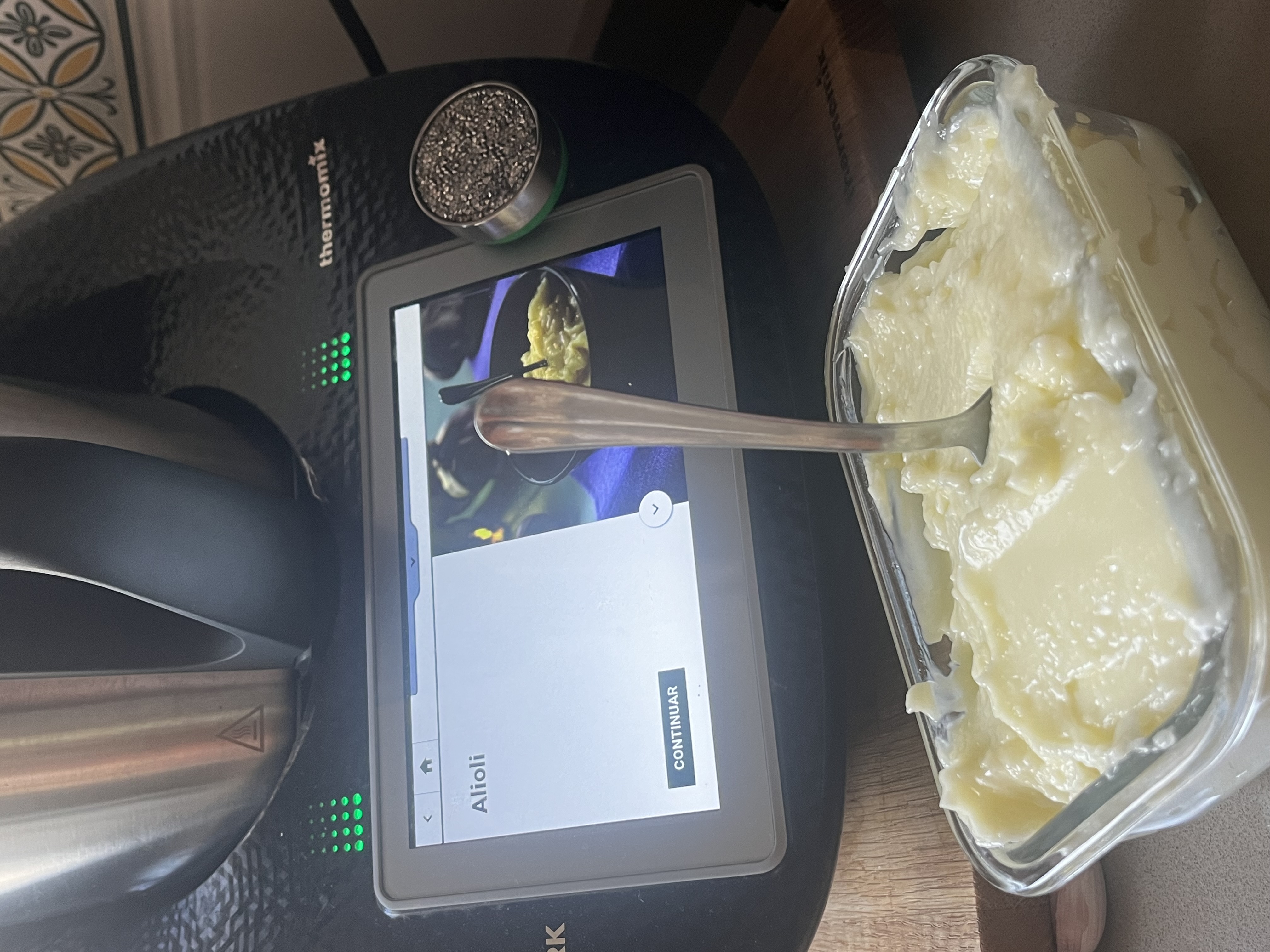 El alioli casero es de lo mejor que tenemos en Thermomix, lleva siempre un poquito de aceite de oliva extra , acento de girasol, un poquito de sal y sobre todo lo que lleva son 50 g de ajo, que son una cabeza de mediana a grande.