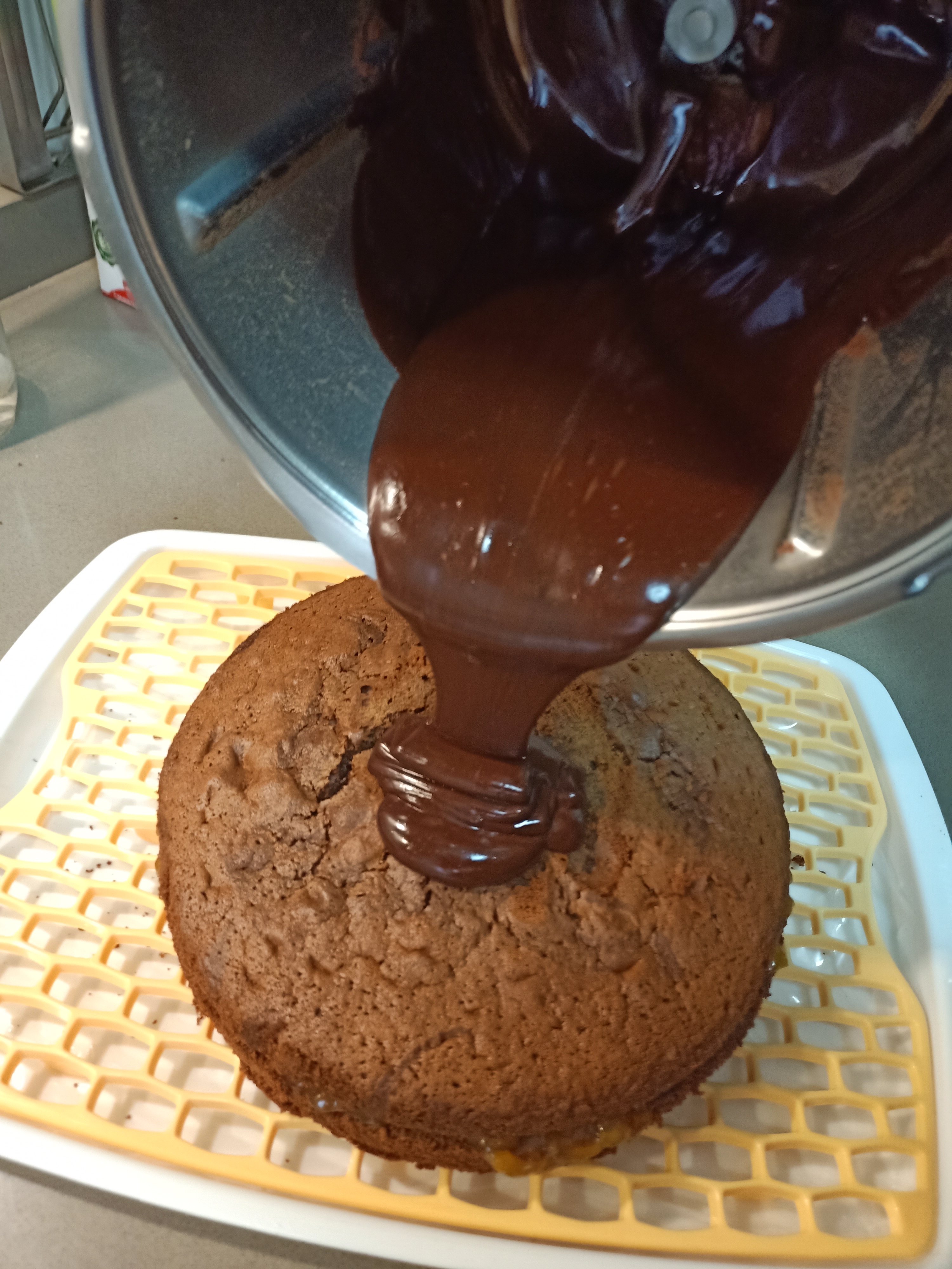 Añada agua 4min/50/vel 2. Añada mantequilla casera y mezcle 4min/50/vel 2. Colocamos en la bandeja con rejilla y la echamos la cobertura y alisamos con espátula para que quede lisa y brillante.