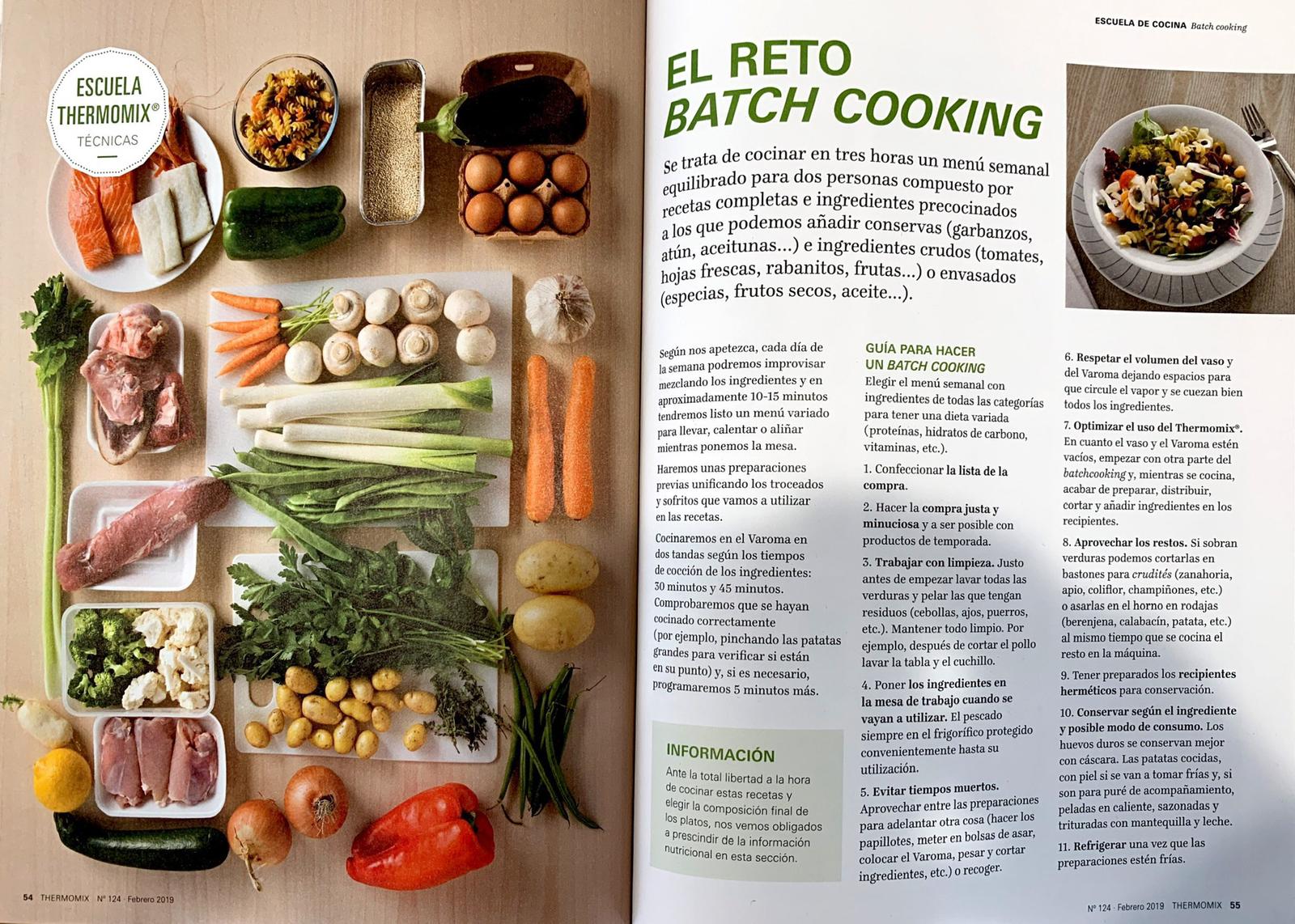 Para diseñar un menú batch cooking debemos tener presente COMO CONSERVAR LOS ALIMENTOS, bien congelarlo o envasarlo al vacío,, debe ser SALUDABLE, y debemos PREPARARLO DE UNA SOLA VEZ , en la revista tienes en tres horas un menu para dos para una semana.