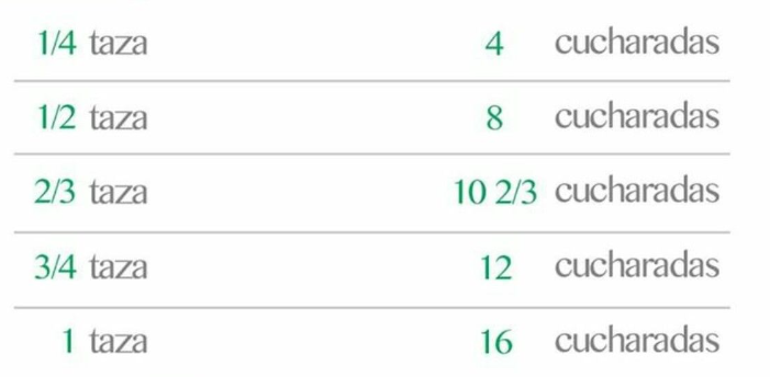 ¿Y si queremos saber cuántas cucharadas son las tazas? Equivalencia de taza a cucharadas: