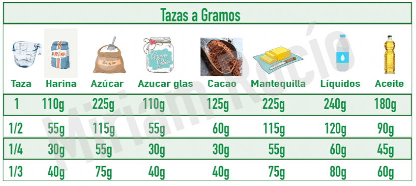 En cuanto a las medidas en tazas que solemos usar cuando cocinamos con nuestras recetas, tenemos que tener en cuenta que una taza o vaso de harina no es lo mismo que uno de arroz o de azúcar... Tenemos que ver su textura, su densidad y su consistencia. (Y siempre sin hacer presión en el producto, sin prensarlo). Por regla general;