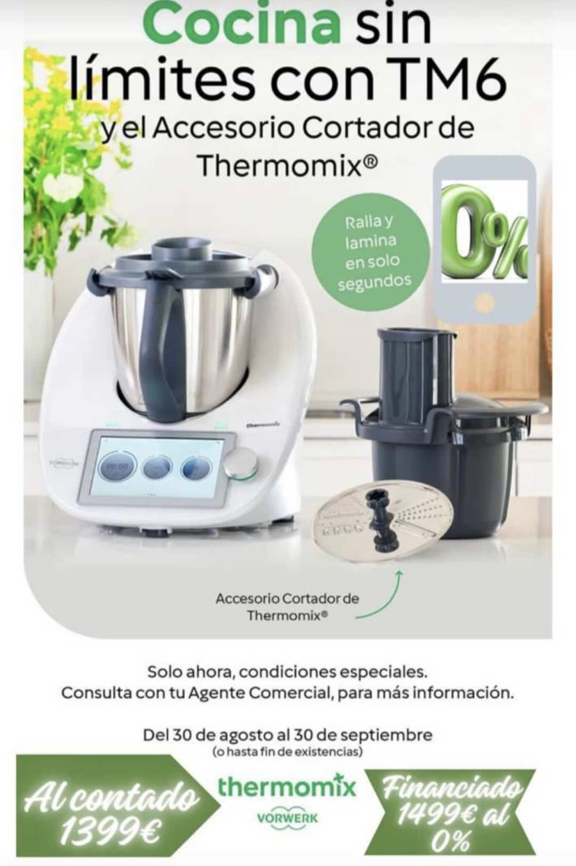Promoción TM6 en septiembre 2024: al adquirir este modelo antes del 30 de septiembre, recibirás de regalo el accesorio cortador, ideal para laminar y rallar ingredientes de manera rápida y sencilla. Además, tienes la opción de pagar al contado o con un plan de financiación a 0% de interés, facilitando la compra .