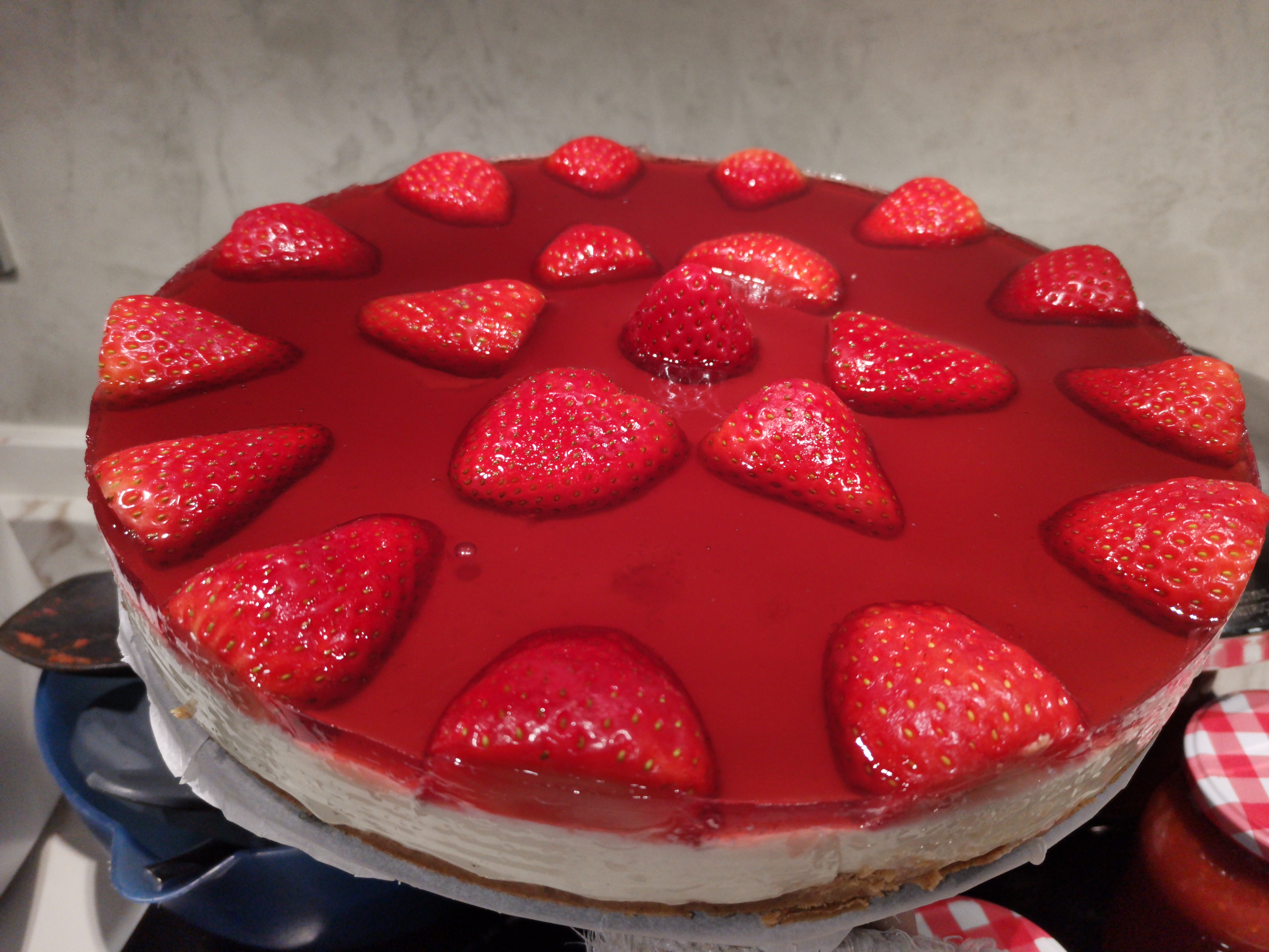 Corte las fresas a la mitad y coloquelas sobre la tarta, ejerciendo una leve presión para que se queden fijadas a la tarta. Debe hacerse cuando haya empezado a cuajar, mínimo 1o minutos.