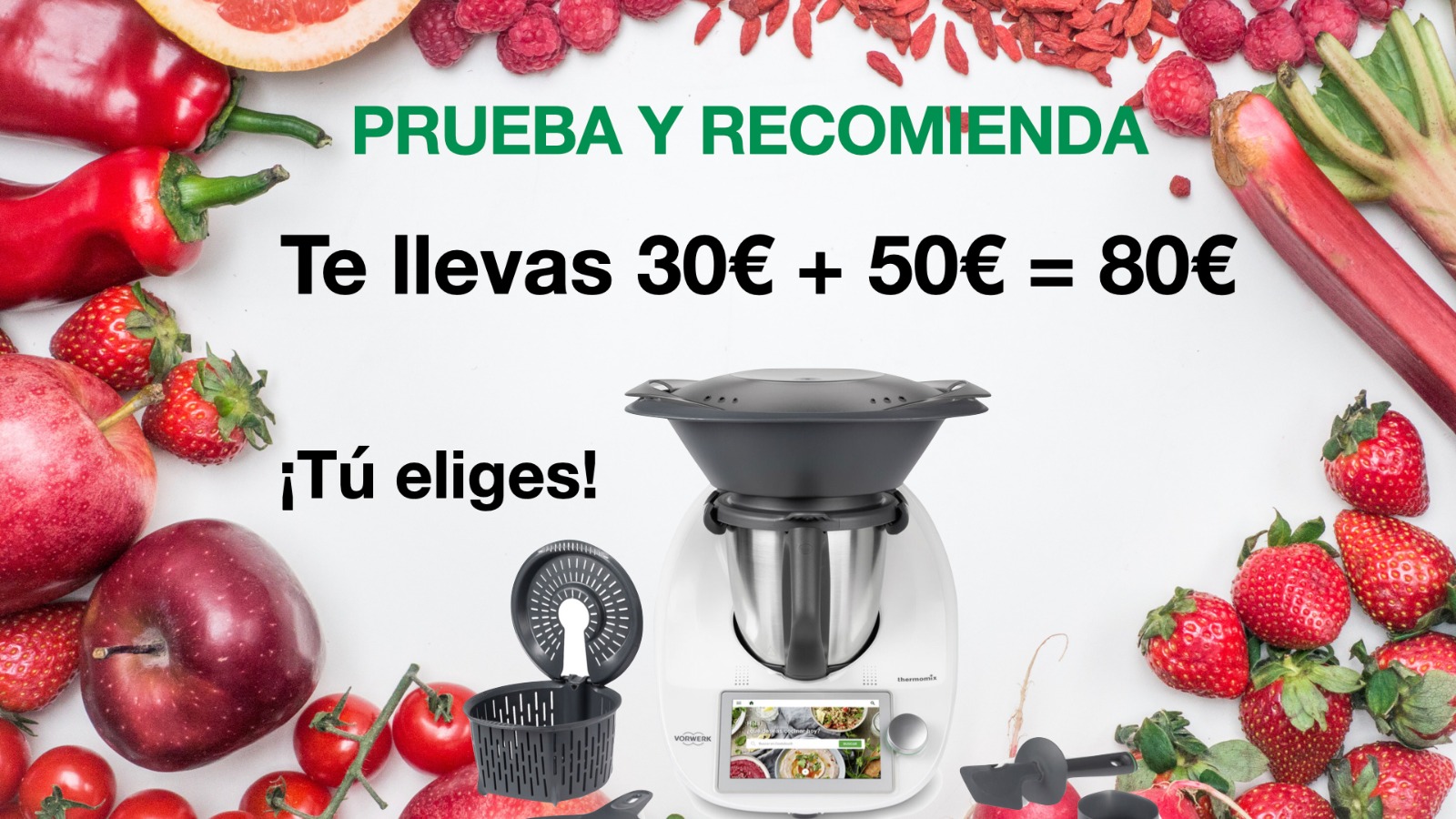 Pero ahí no acaba todo, si además recomiendas a alguien de tu entorno el nuevo Thermomix, tambien recibes un cheque de 30 € para comprarte lo que más te guste en nuestra tienda online.