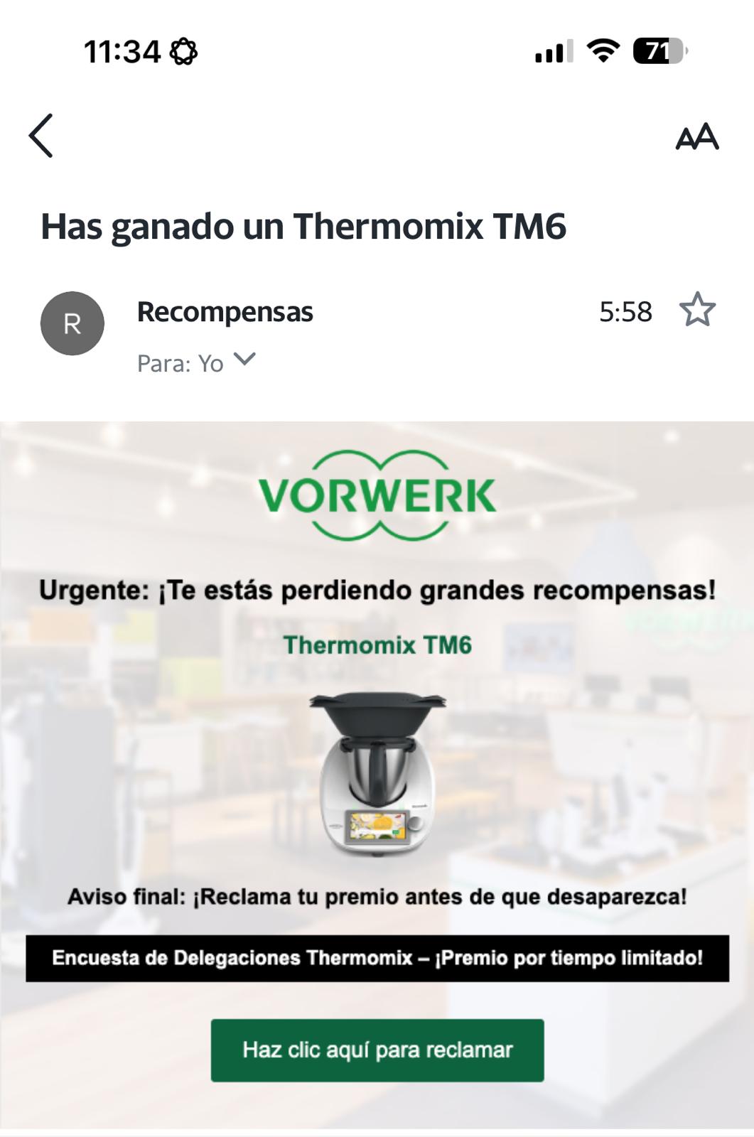 En este caso es mediante un link que “supuestamente” te hace participar en un sorteo para tener un thermomix GRATIS DE REGALO o en otro directamente sin participar te manda el link de canje de tu regalo ?.