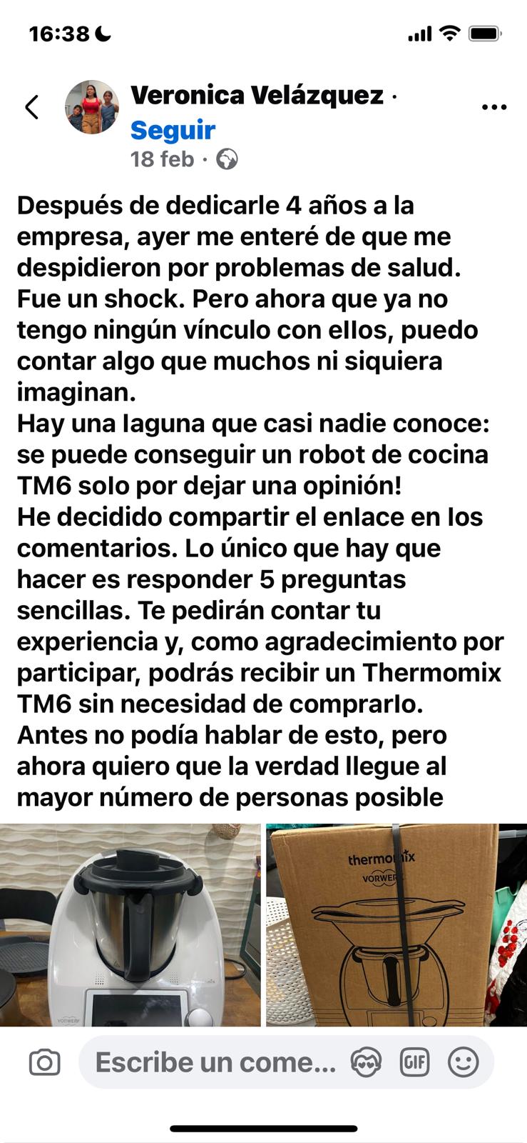 Me habéis preguntado, por varias publicaciones tanto en facebook como en instagram o en tic-tok, (sobre todo en la primera), en la que un perfil (que desconocemos autenticidad y que ya ha sido denunciado como spam o fraude), habla de nuestra empresa, no de manera muy favorable, (cada uno es libre de expresar su opinión y experiencia como quiera), pero describe una manera poco creíble de conseguir gratis un Thermomix®. Os dejo foto remitida por una de mis clientas.