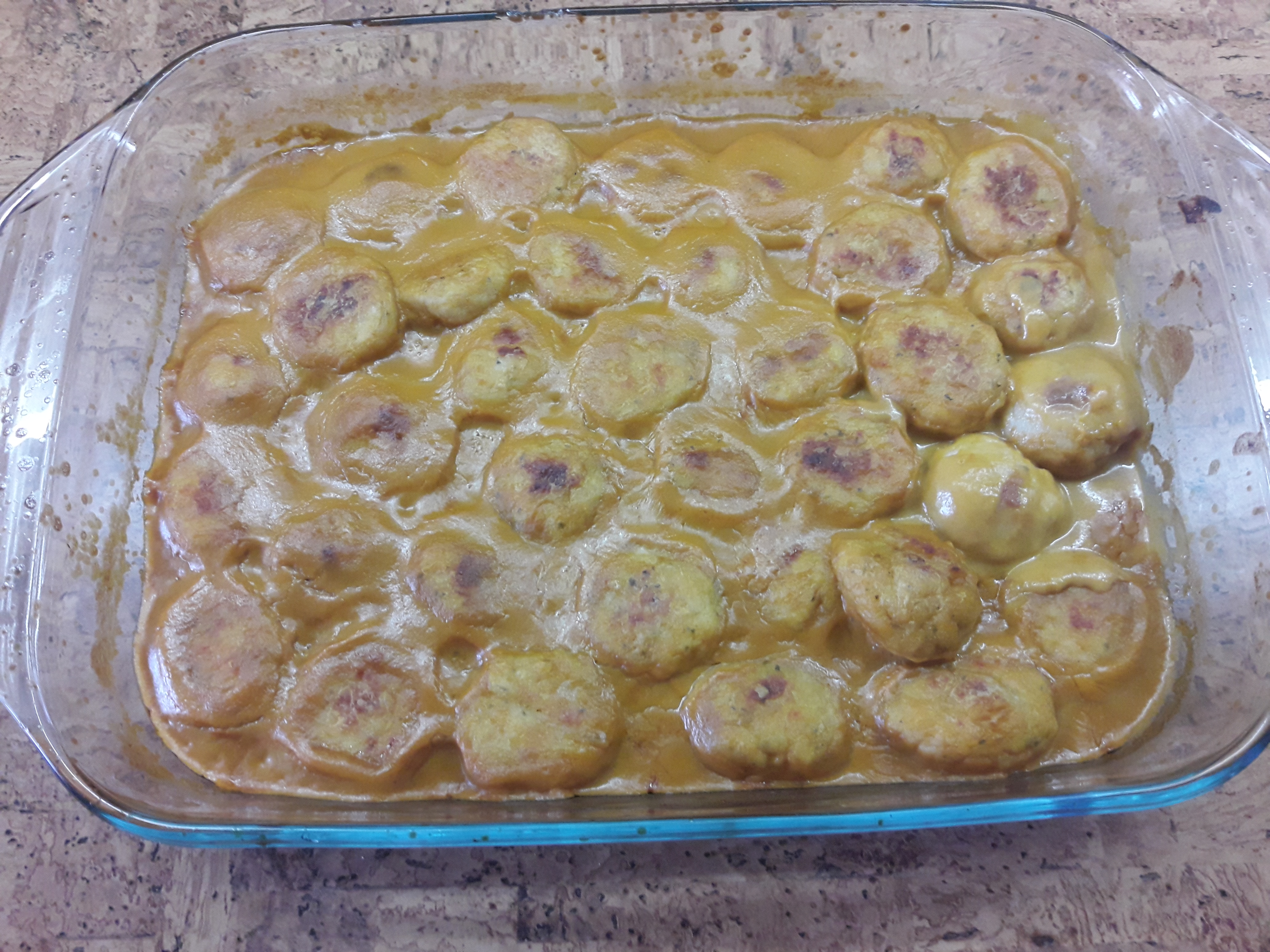 Incorpore al vaso el vino y, sin poner el cubilete, evapore 1 min/Varoma/vel 1. Mientras tanto, dele la vuelta a las albóndigas y hornee durante 5 minutos (180ºC). Retire la fuente y mantenga el horno encendido.