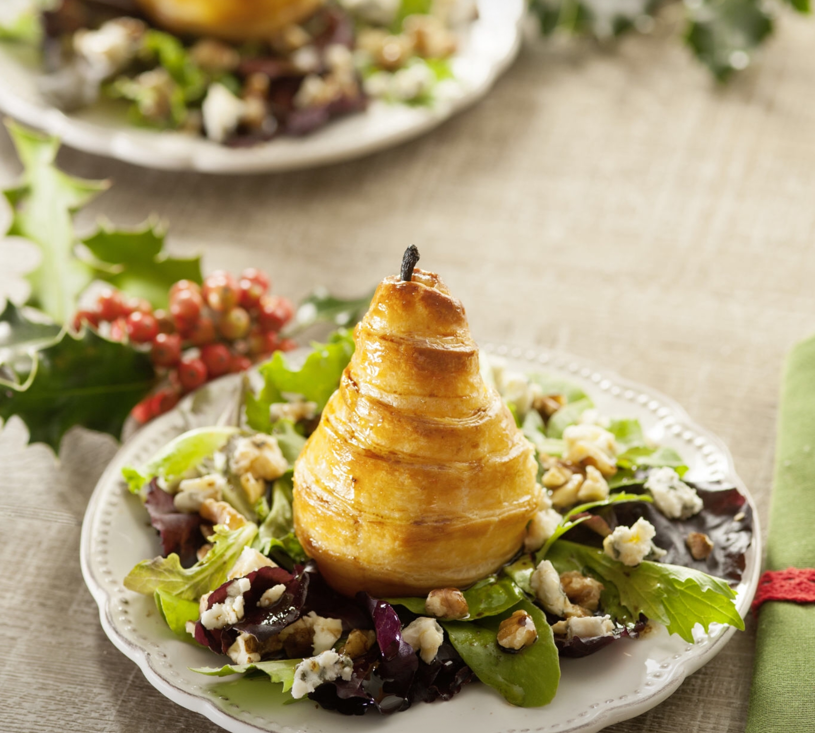 PERAS EN HOJALDRE Y ENSALADA DE ROQUEFORT Y NUECES